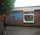 Dem Kindergarten, dessen unauffälliges Erscheinungsbild vierzig Jahre nach der Erstellung noch nahezu unverändert erhalten war, sollte ein kindgerechtes Aussehen mit kindgerechten Elementen gegeben werden.